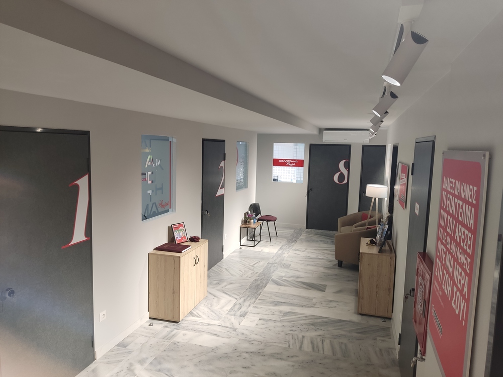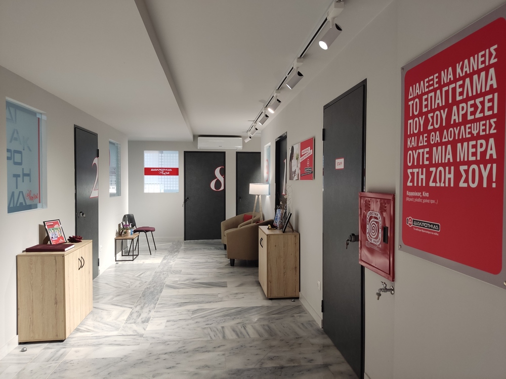 Δεν είναι τυχαίο ότι οι εγκαταστάσεις μας έχουν ήδη γίνει πόλος έλξης για πολλούς υποψήφιους Καθηγητές μας που θα ήθελαν να διδάξουν διαδικτυακά. Στο χώρο λειτουργεί το φιλόξενο lobby του Διαδικτυακού, ένα πλήρως εξοπλισμένο meeting room και ευρύχωρη κουζίνα με το περίφημο ρολόι ΩΡΑ ΓΙΑ ΔΙΑΚΡΟΤΗΜΑ.