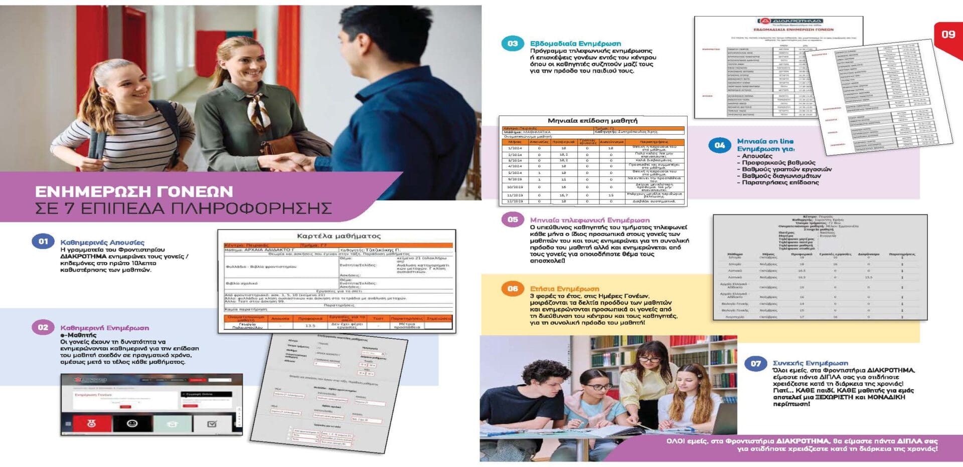 - Ηλεκτρονικές καρτέλες αποτυπώνουν ανά δίωρο μαθήματος την επίδοση του μαθητή, ανά ημέρα προσέλευσης του στο φροντιστήριο, (με αναλυτική βαθμολογία σε προφορικά, γραπτά, test και διαγωνίσματα, μαζί με τα σχόλια των εκπαιδευτικών για την πρόοδο και τις απουσίες του μαθητή), οι οποίες είναι συνεχώς διαθέσιμες στους γονείς και κηδεμόνες των παιδιών.