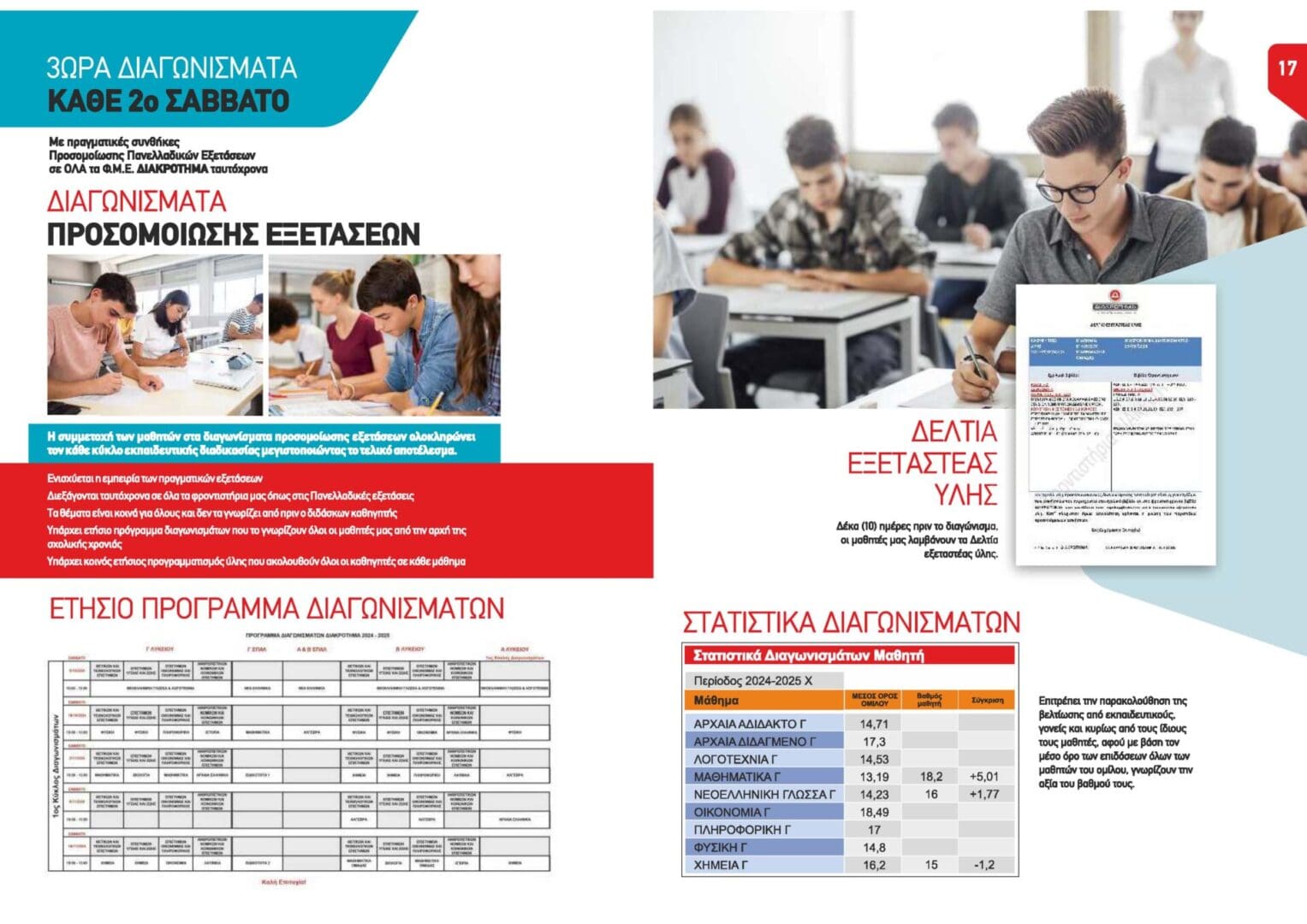 - Τα ολιγόλεπτα διαγωνίσματα στην τάξη (για τη συχνή αξιολόγηση της προόδου του μαθητή), τα τρίωρα διαγωνίσματα κάθε δεύτερο Σάββατο του μήνα (με συνθήκες προσομοίωσης πανελλαδικών εξετάσεων) και ο ειδικός κύκλος προετοιμασίας στις διακοπές των Χριστουγέννων και του Πάσχα, είναι πολύ σημαντικά κομμάτια στην εκπαιδευτική διαδικασία και υποχρεωτικής συμμετοχής από τους μαθητές.